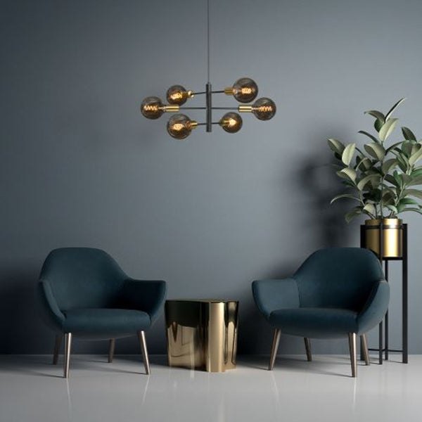 Designer pendant with decorative brass socket covers. The fixture can be shaped by adjusting the arms along the horizontal axis. Suitable for LED light sources with an E27-base.