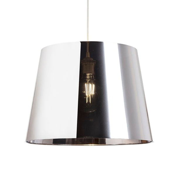 Decorative shade of chrome-colored foil, that can be combined with a pendant set or floor lamp stand. When the lamp is lit it becomes semi-transparent, and when it is powered off it has a reflective surface. Suitable accessories: HEX, ELISA, ENZO, LISA, KOMBIX, BEND, ALVIS, AMBITUS, NYC.