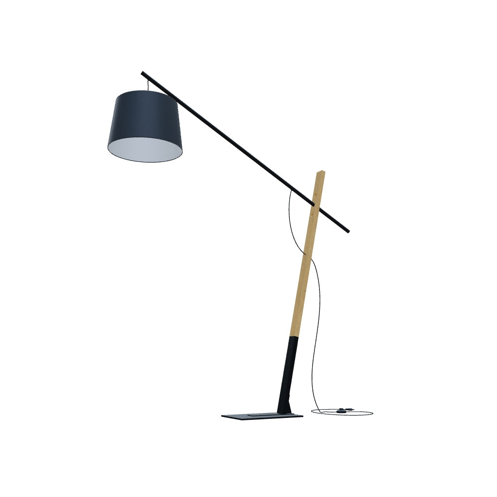 A massive design floor lamp suitable for spacious interiors. Combination of wood, metal and textile shade.