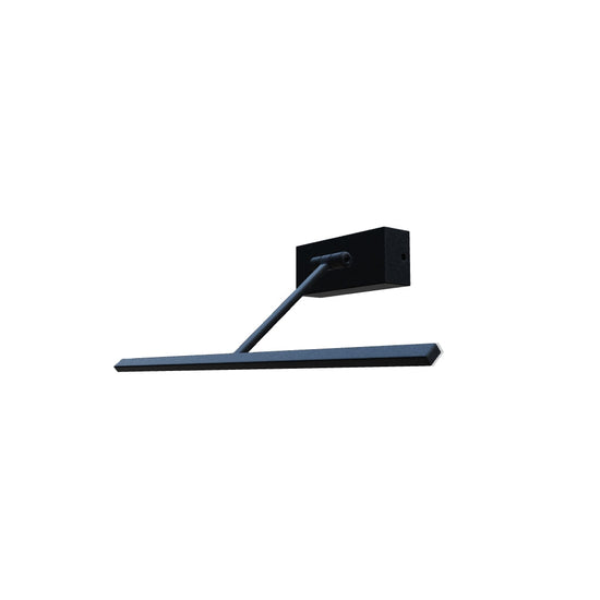 Wall-mounted LED light with an adjustable arm on a vertical axis, ideal for illuminating paintings.
