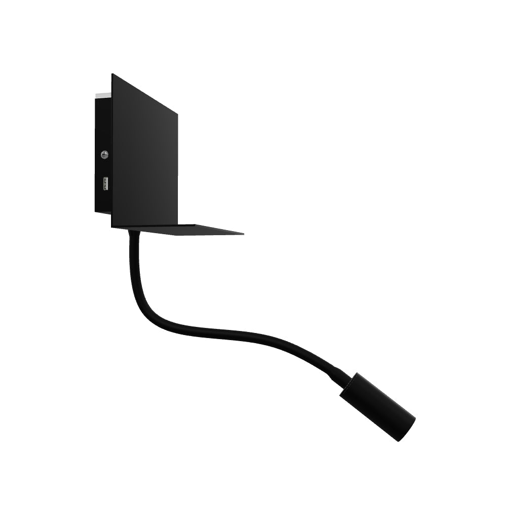Shelf with built in LED and USB port for charging of cell phones. Both the indirect light source and the gooseneck spotlight are toggled by individual switches.