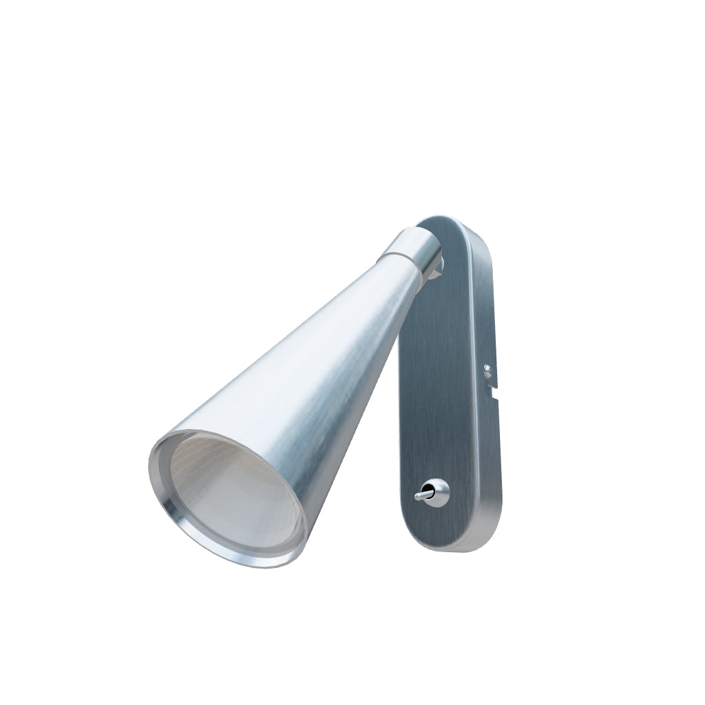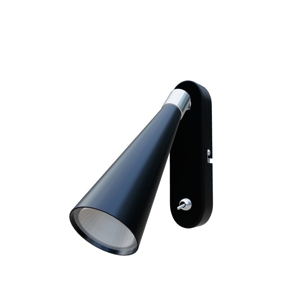 Nástěnné svítidlo s kónickým reflektorem pro LED žárovku s paticí GU10, páčkový vypínač je umístěný na základně.