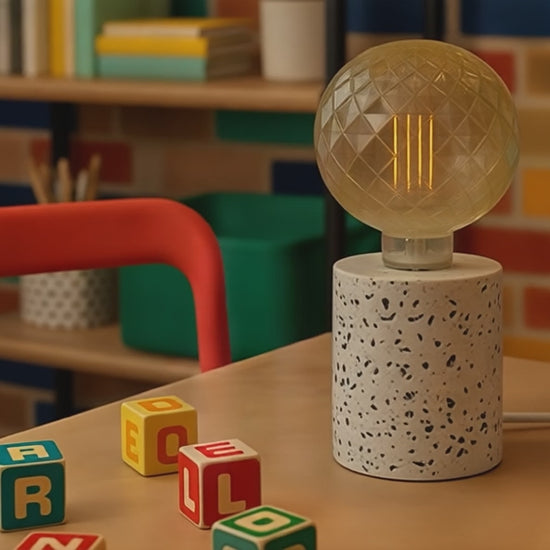 Minimalistická stolní lampička válcového tvaru, pro dotvoření celkového designu vhodnou žárovkou. Dekor každého svítidla je originální.
