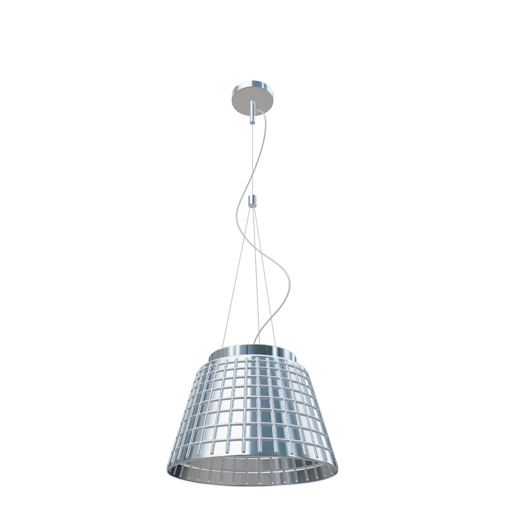 Závěsné svítidlo s masivním strukturovaným sklem. Sklo je z obou stran pochromované. Při rozsvícení je světelný zdroj částečně viditelný.